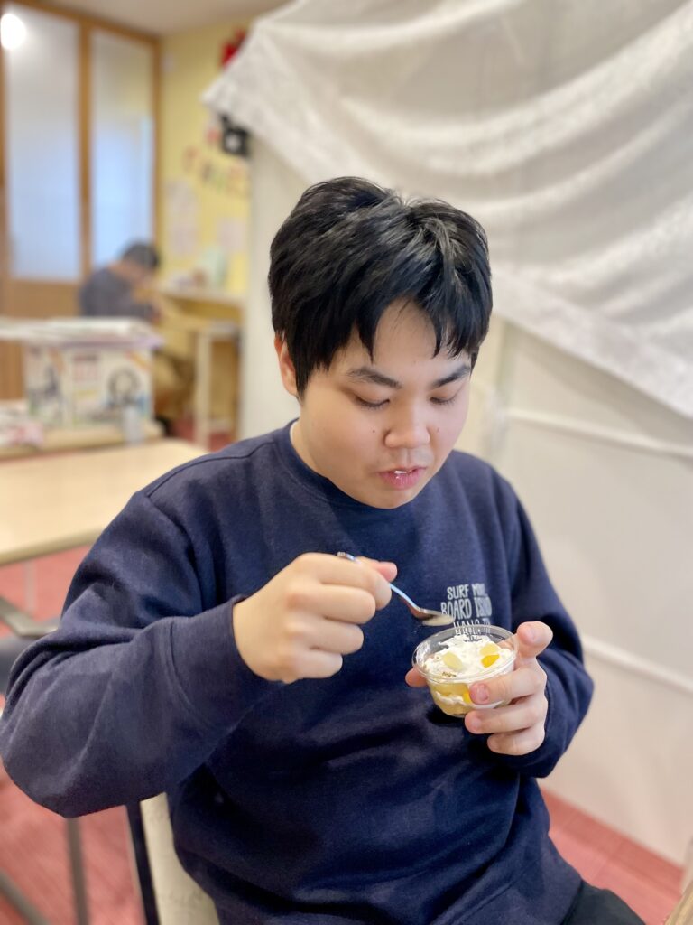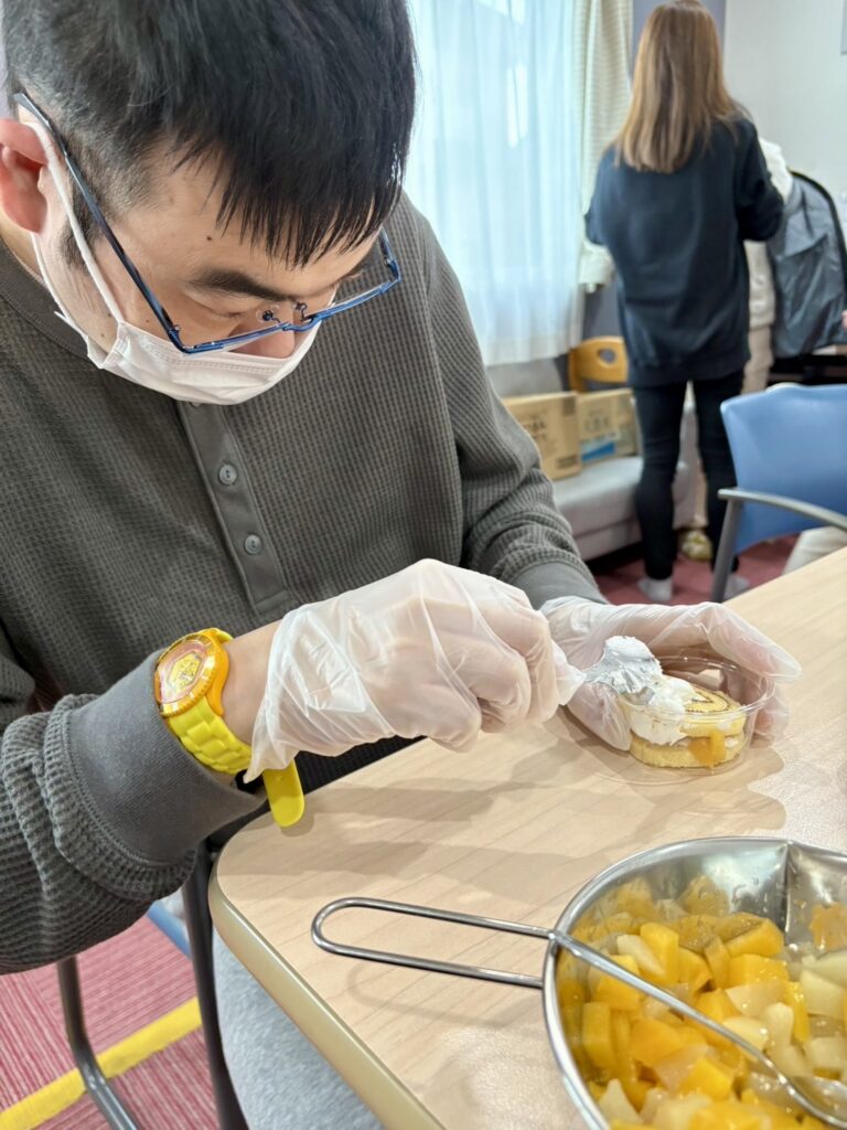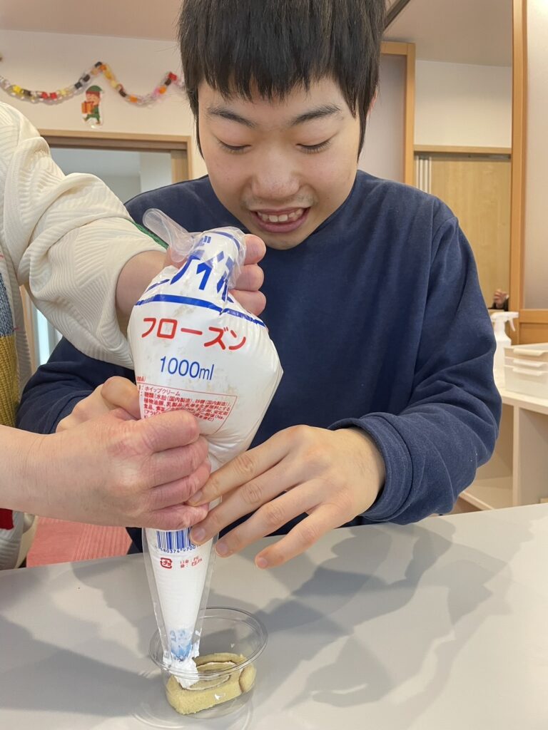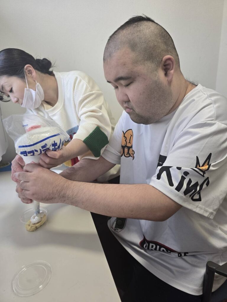 カップケーキ作りでは、ロールケーキに生クリームやお好みのフルーツをトッピングして、午後のおやつにしました🍰